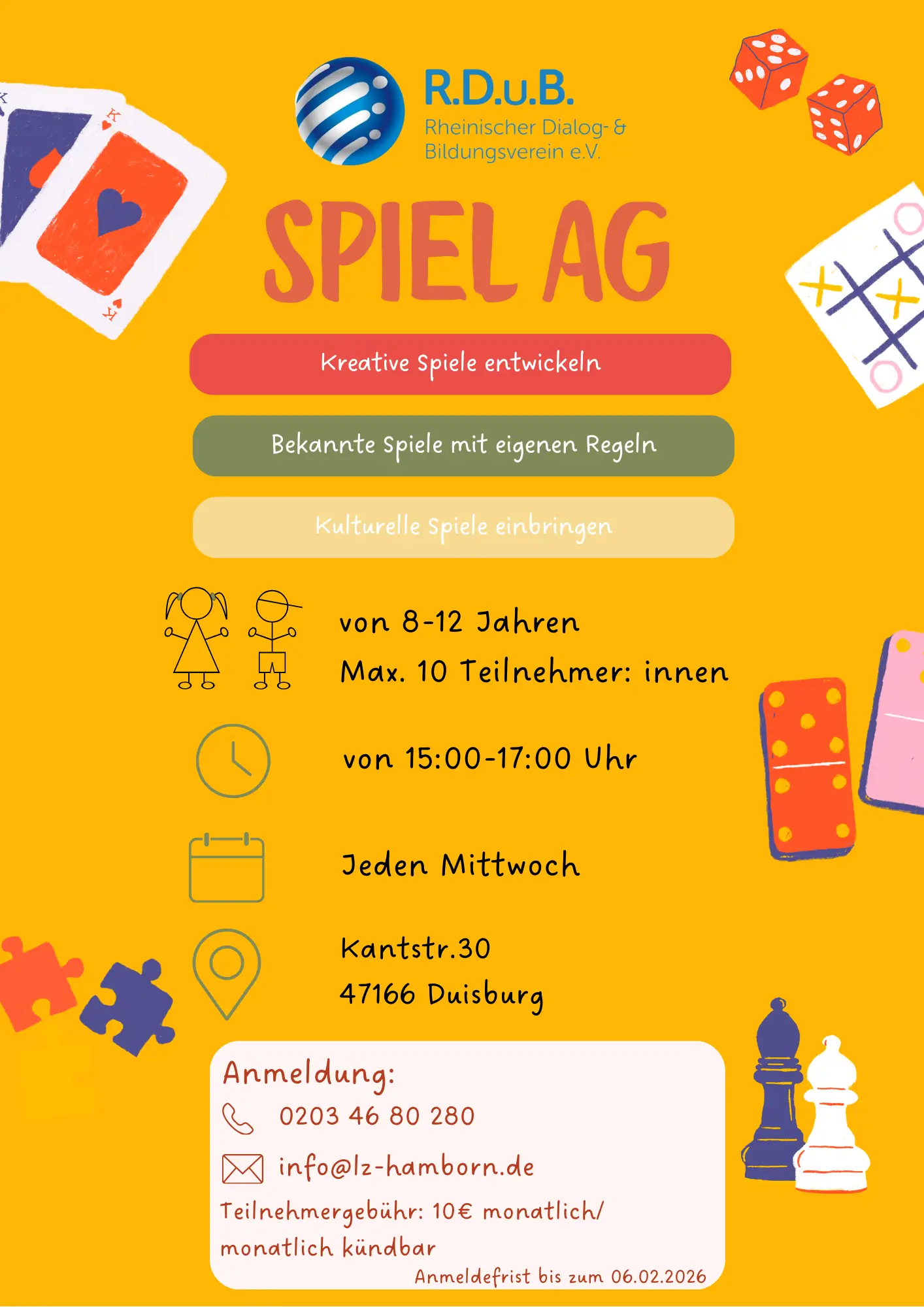 Mit dem Projekt Spiel AG möchten wir Kinder im Alter von 8–12 Jahren durch gemeinsames Spielen in ihrer Kreativität, sozialen Kompetenz und interkulturellen Offenheit stärken. In einem geschützten und spielerischen Rahmen entwickeln die Teilnehmenden eigene Spiele, lernen bekannte Spiele mit neuen Regeln kennen und bringen Spiele aus unterschiedlichen Kulturen ein. Das Projekt fördert Teamarbeit, Kommunikation, Fantasie und gegenseitigen Respekt.